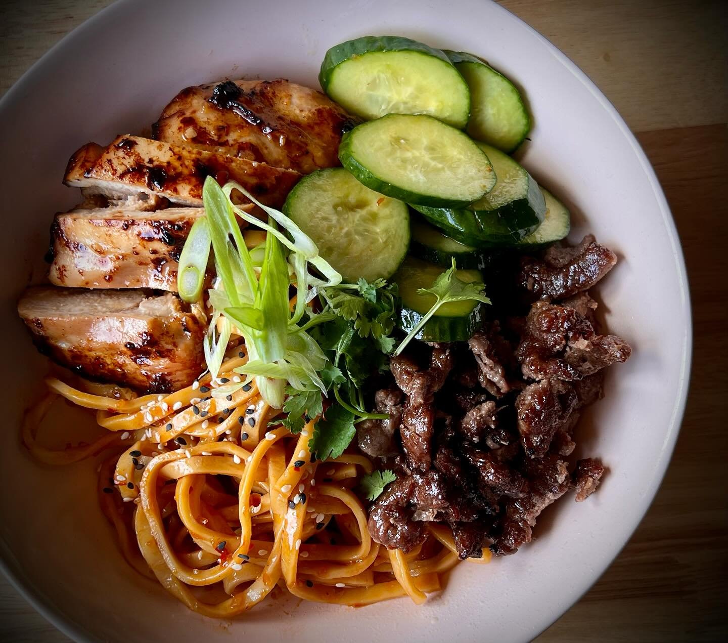 Beet ‘ Poke’ Bowl | Calrose Rice | Umami Cucumber | Edamame | Pickled Ginger Shaved Red Onion | Avocado | Sriracha Aioli -gf -vegan